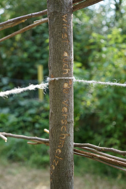 Dabei greift Ellen Martine - körperliche Arbeit ist Teil ihrer künstlerischen Herangehensweise, ebenso wie die Auseinandersetzung mit Traditionshandwerken - auf unterschiedliche Materialien zurück, u.a. auf Haselholze, eine unmittelbar nach der letzten